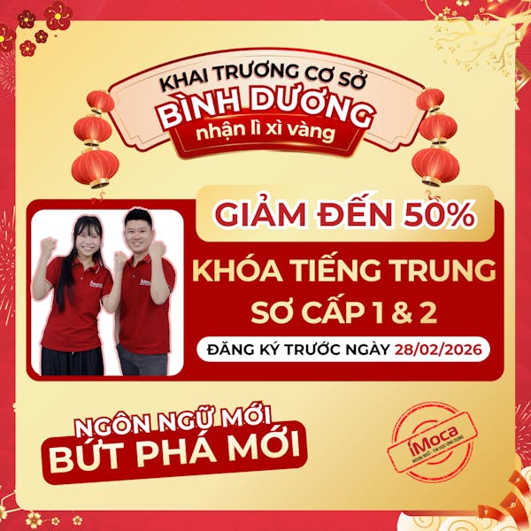 Nhân dịp khai trương cơ sở iMoca Bình Dương, trung tâm triển khai chương trình ưu đãi đặc biệt “Khai trương cơ sở Bình Dương – Nhận lì xì vàng” dành cho học viên đăng ký các khóa học tiếng Trung sơ cấp. Đây là cơ hội tốt nhất trong năm để bắt đầu hành trình học tiếng Trung với chi phí tiết kiệm nhất.